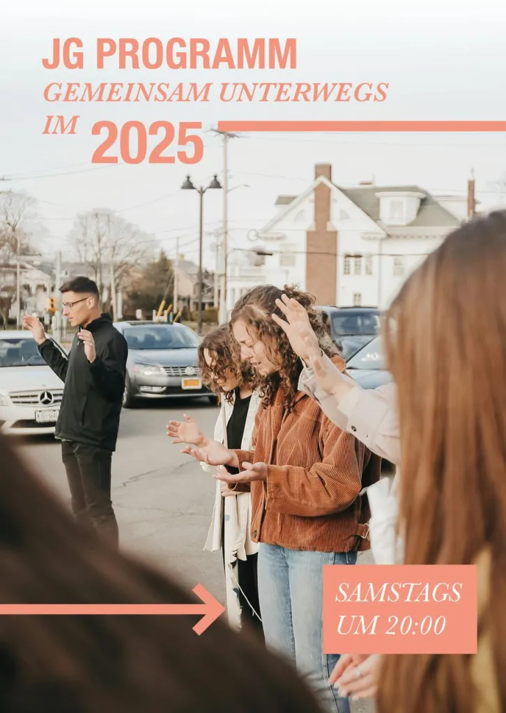 In der JG treffen wir uns jeden zweiten Samstag, um gemeinsam im Glauben zu wachsen. Zusammen möchten wir, mit Input und Worship, Zeit mit unserem Gott verbringen. Ebenfalls sind uns actionreiche Aktivitäten und Gemeinschaft wichtig. Genauere Informationen werden per WhatsApp-Chat kommuniziert.